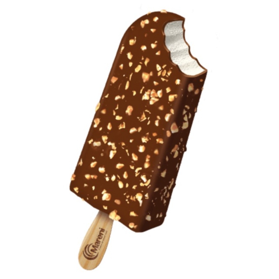 PICOLÉ DE NATA COM RECHEIO DE CHOCOLATE AO LEITE , E COBERTURA DE CHOCOLATE BRANCO COM AMENDOIM